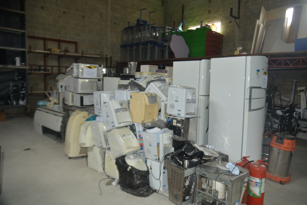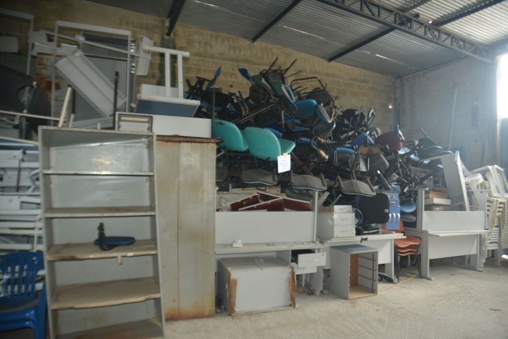 A conferência dos bens inservíveis entre os lotes 32 e 36 é feita em um galpão, na Avenida Pedro Gonçalves Leite, 550 – Perequê-Mirim.