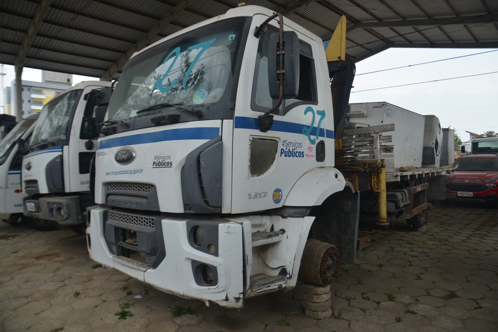 A pá-carregadeira e os caminhões Munck e tanque dos lotes 26, 27 e 28 se encontram no pátio da Secretaria de Serviços Públicos, no Jardim Aruan. O prédio fica na Avenida Rotary, n° 366 – Jardim Aruan.